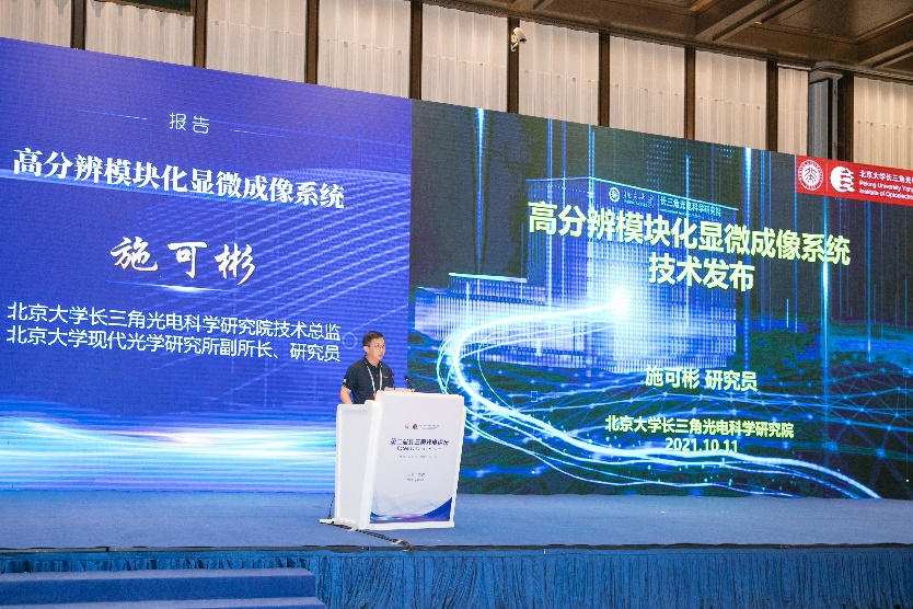 微纳光学精准检测研究室主任肖云峰教授进行了《光学微腔传感技术与设备》的技术发布。他介绍了超高灵敏光学传感新技术背景以及超高Q光学微腔制备自动化技术方案,并提出了超高灵敏传感技术和光学微腔封装方面的发展愿景与合作意向。光电子芯片与信息系统研究室副主任杨丰赫博士进行了《硅基光电子技术开发平台》的技术发布。他介绍了在研究院打造的硅基光电子技术开发平台的技术背景和平台条件,并从芯片设计测试、电路设计测试、光学及电学先进封装、管壳设计及精密制造等四个方面重点介绍了平台所具备的技术能力,同时也发布了一系列硅基光电子芯片与模块的代表性成果。高分辨显微成像研究室主任施可彬研究员进行了《高分辨模块化显微成像系统》的技术发布。实验室通过将飞秒激光技术、核心计算成像算法和多模块系统集成设计,在无标记超分辨成像技术和飞秒激光研发基础上,研发完成了具备多模式成像功能的高分辨模块化显微成像系统及工程样机,现已能满足一定的科研市场需求,具备了开放实验室的平台测试能力。