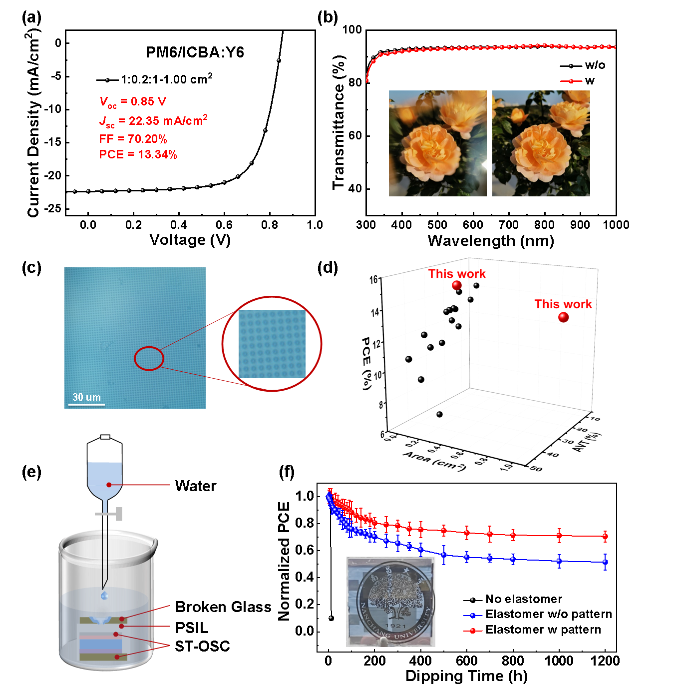 图4 (a)封装大面积半透明有机光伏器件J-V曲线 (b)无图案和图案化弹性体薄膜的透射光谱以及透过薄膜(左)和在空气中(右)拍摄的实物照片 (c)图案化弹性体薄膜的光学显微镜图像 (d)近两年来半透明太阳电池相关参数 (e)模拟降雨实验示意图 (f)无弹性体、无图案弹性体和图案化弹性体封装的大面积半透明有机光伏器件归一化光电转换效率随浸润时间的变化曲线