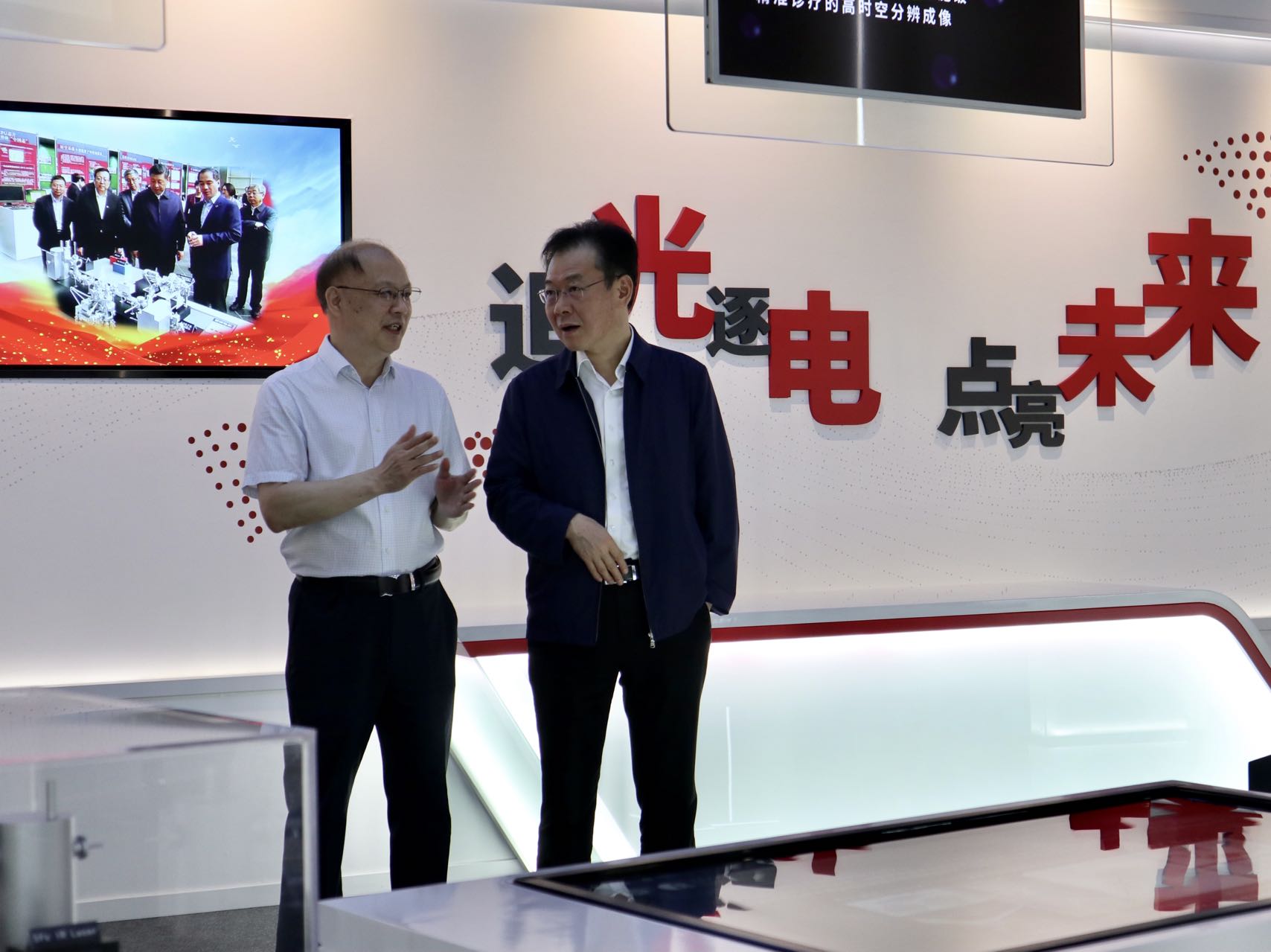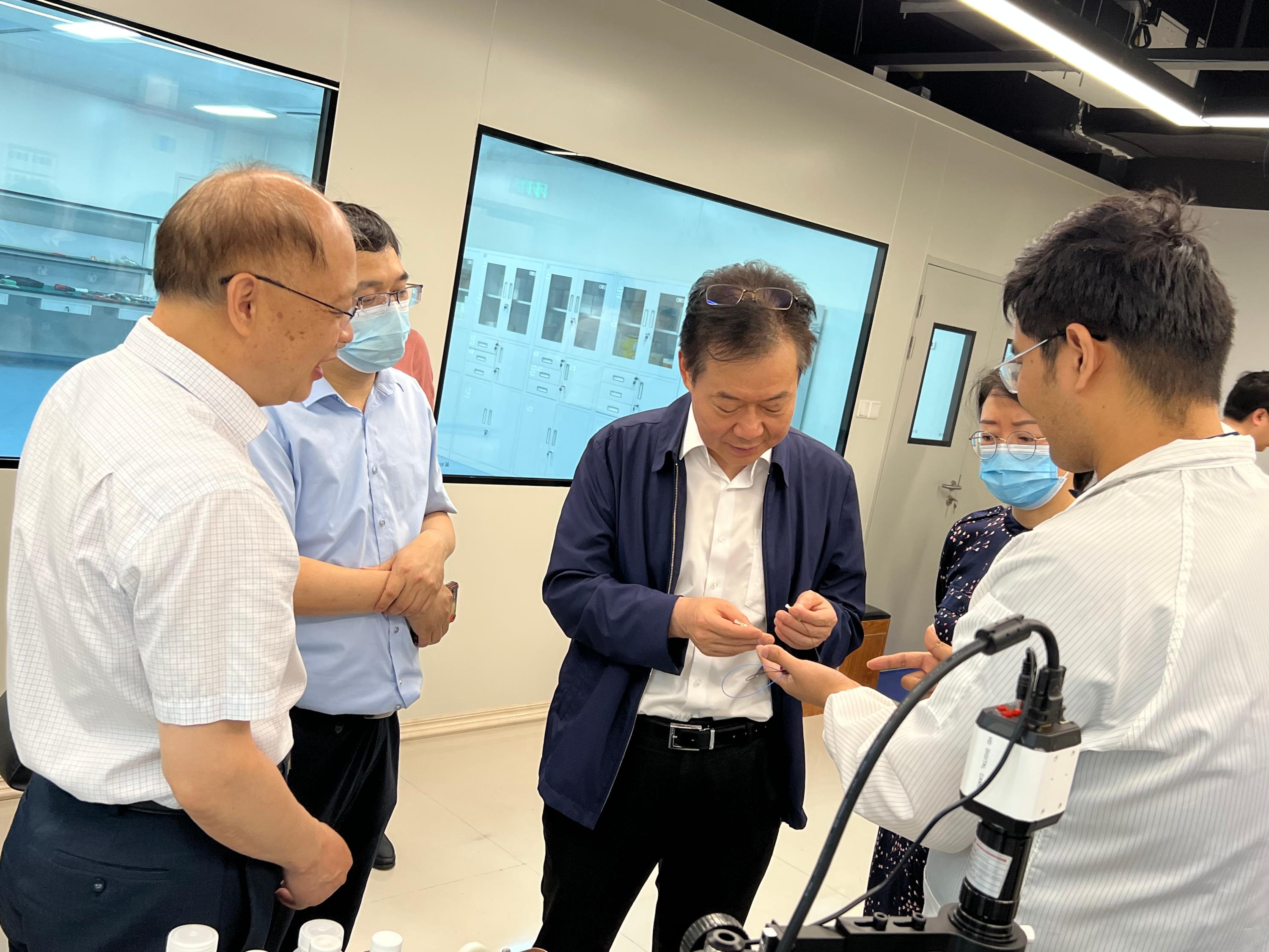 随后,潘建华一行参观了我院技术研发中心的5个实验室,详细了解了各实验室的技术路线、技术水平、技术成果转移转化进展,与实验室相关人员就各自技术领域的内容进行了深入探讨。高分辨显微成像研究室主任施可彬研究员、光电子芯片与信息系统研究室副主任杨丰赫博士、微纳光学精准检测研究室副研究员张方醒博士、能源光电子研究室副主任吴疆博士、高分子光电印刷研究室副主任胡笑添研究员分别介绍了各自实验室的建设情况、研发进展以及产业化应用前景。