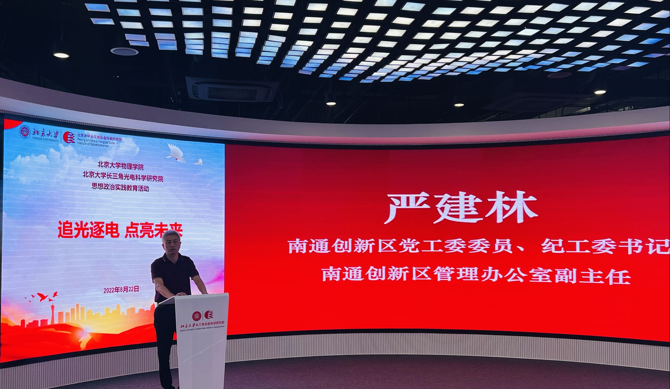 8月22日下午,北京大学思想政治实践课教育基地揭牌仪式在我院成功举行。南通创新区党工委委员、纪工委书记、通创办副主任严建林,南通市中央创新区建设投资有限公司党委副书记、总经理戴峰,南通高等研究院有限公司副总经理丁佳圆受邀出席揭牌仪式,北京大学物理学院党委副书记、我院院长李焱,北京大学物理学院团委书记(实践团指导教师)张帆参加活动。我院副院长、党支部书记孙泉主持揭牌仪式。