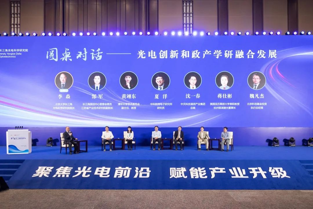论坛最后进行的“光电创新和政产学研融合发展”圆桌对话由李焱主持,邀请了长三角国家技术创新中心管委会委员、江苏省产业技术研究院副院长郜军,清华大学学术委员会副主任、教授黄翊东,中科院微电子研究所研究员夏洋,中天科技通信产业集团总裁沈一春,美国亚历桑那大学光学学院兼职教授、杭州银湖激光董事长蒋仕彬,北京科创基金投资执行总经理魏凡杰参加。