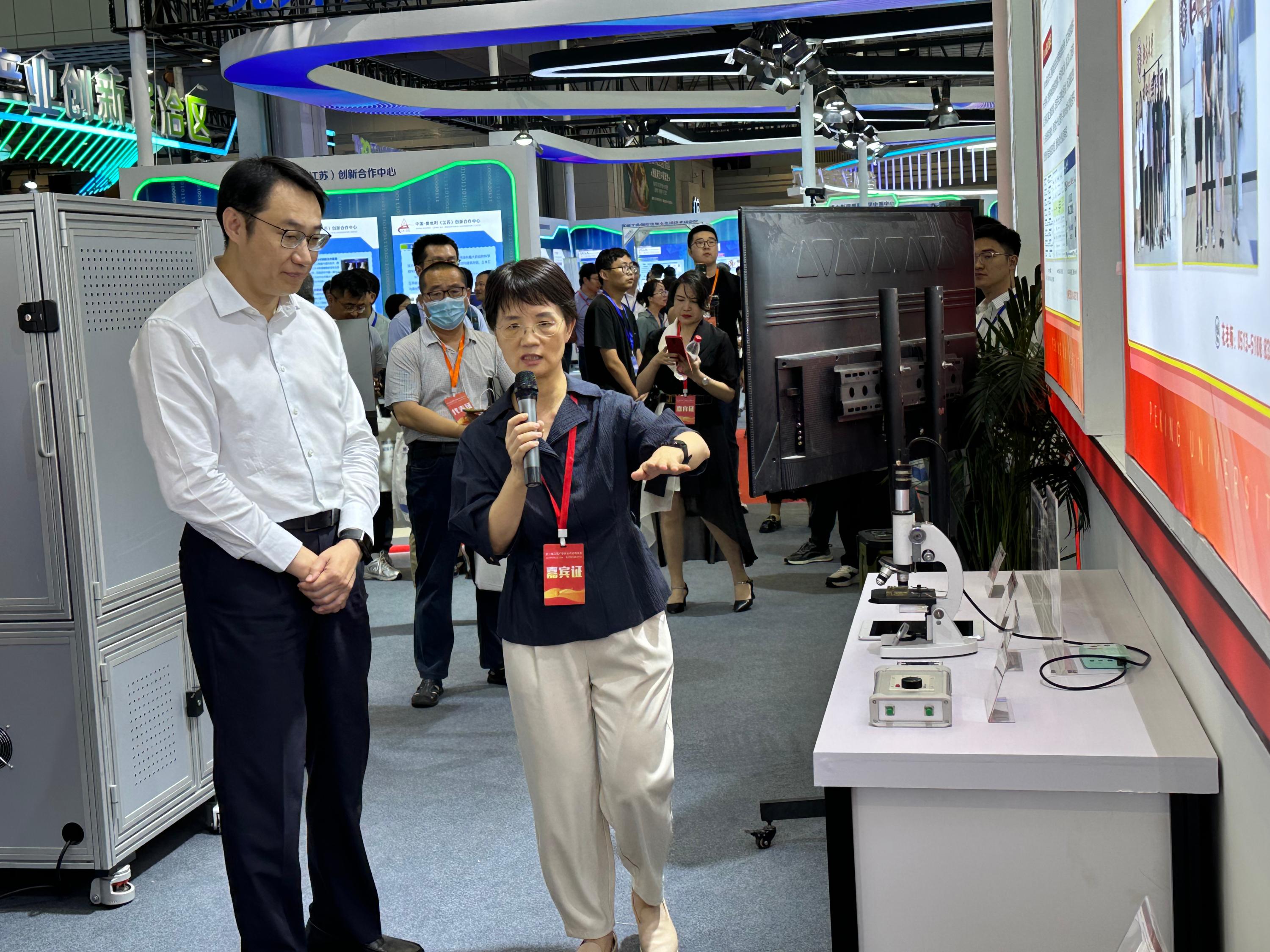 9月11日上午,第十四届全国政协委员、江苏省人民政府党组成员赵岩,江苏省委组织部副部长季振华分别莅临我院展位参观指导工作。杨宏副院长接待了来访嘉宾,详细介绍了研究院的最新研发成果,并且重点介绍了活细胞超分辨全景显微镜产业化研发及应用情况。