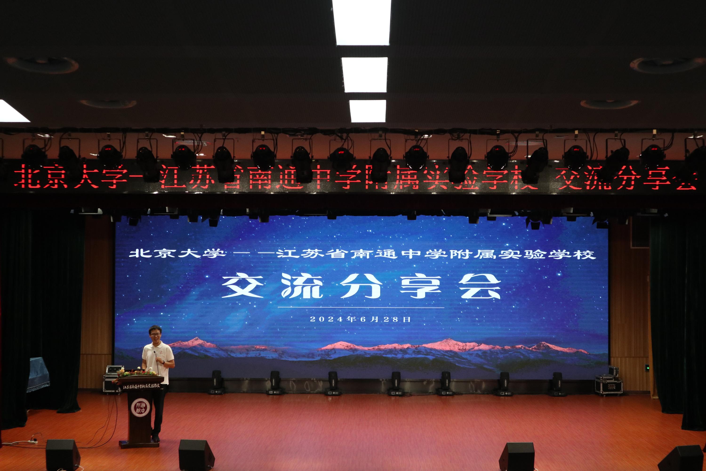 当日下午,实践团部分学生走进南通中学附属实验学校,参观学校并进行学习经验及北大学习生活分享交流。在南通中学附属实验学校党政办主任陈志良的带领下,实践团参观了学校的各类特色教室,如模拟法庭,人工智能创新实验室,无人机教室等。随后,实践团的学生与通中附校的学子漫谈北大的学习生活,同时带来有关物理学的介绍,并在讲解过程中与现场的同学们进行了有趣且有料的互动与交流。