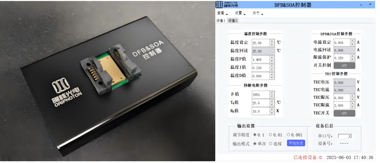 此外,提供配套蝶形光器件(DFB&SOA)控制器,该控制器,采用数字PID算法,提供配套上位机软件,可实现器件驱动电流和温度的实时精确控制和反馈测量。可根据客户需求灵活定制器件驱动电流和TEC驱动电流等参数。