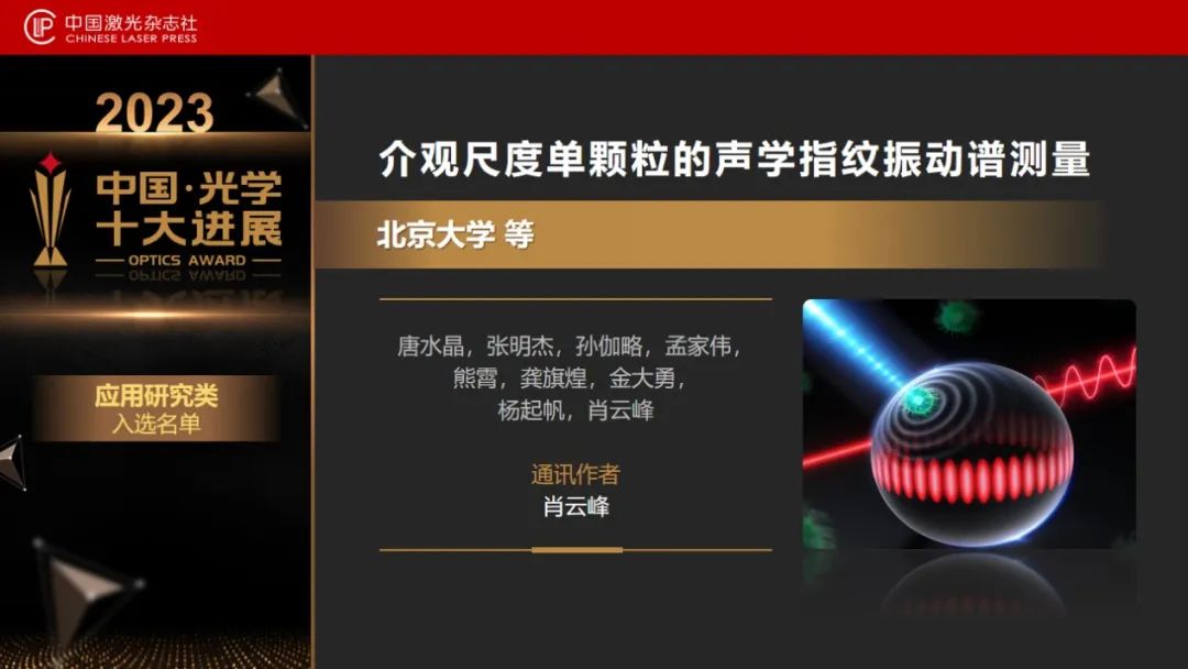 近日,“2023中国光学十大进展”揭晓,北京大学物理学院肖云峰教授、龚旗煌院士团队的“介观尺度单颗粒的声学指纹振动谱测量”入选“2023中国光学十大进展”(应用研究类)。