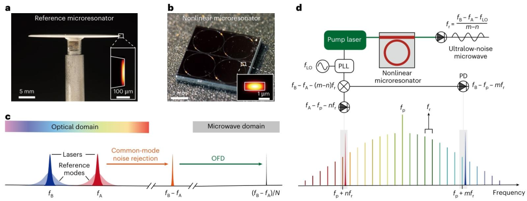 a,MgF₂参考光学微腔实物图片。b,Si₃N₄非线性光学微腔实物图片。c,“两点锁定”光学频率分频原理图。d,光学频率分频实验与结果。