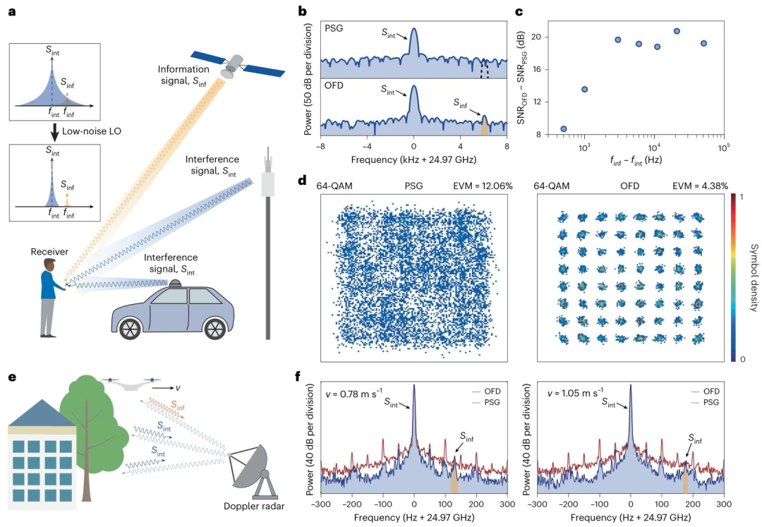 a,抗干扰通信应用场景示意图。b,以光学频率分频系统(OFD)和电子学微波振荡器(PSG)作为通信系统本地振荡器时的信息信号与干扰信号频谱。c,信息信号与干扰信号的频率差对信噪比的影响。d,采用 64QAM 调制格式的信息信号解调后星座图。e,多普勒雷达应用场景。f,以OFD和PSG信号作为雷达载波时的回波频谱。