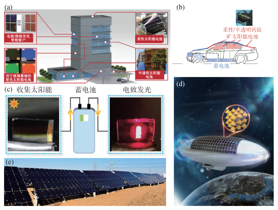 图8 钙钛矿太阳能电池的应用场景 (a)光伏建筑一体化[81];(b)车载光伏[82];(c)钙钛矿太阳能电池/钙钛矿发光二极管双模器件[83];(d)钙钛矿太阳能电池在空间光伏中的应用[84];(e)基于钙钛矿太阳能电池的大型地面电站[85]
