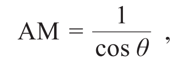 我们可以用“热情似火”来形容宇宙中的太阳,它时刻在以各种形式向外散播能量。用物理学的语言讲,太阳的“热情”可以用5800 K的黑体辐射光谱进行近似模拟。但当这份“热情”到达地面时,已被地球大气中的臭氧、氧气、水蒸气等大幅削弱。为标准化定义经过大气过滤的光谱,人们引入了大气质量(air mass,AM),即太阳光经由大气层所经过的距离与其可能的最短距离之比: