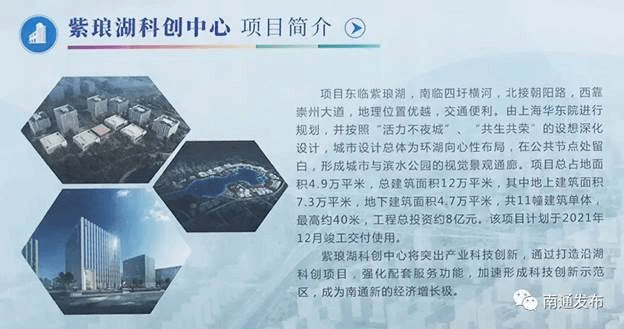 科技创新类项目1个,为紫琅湖科创中心(2号地块),总投资8亿元;