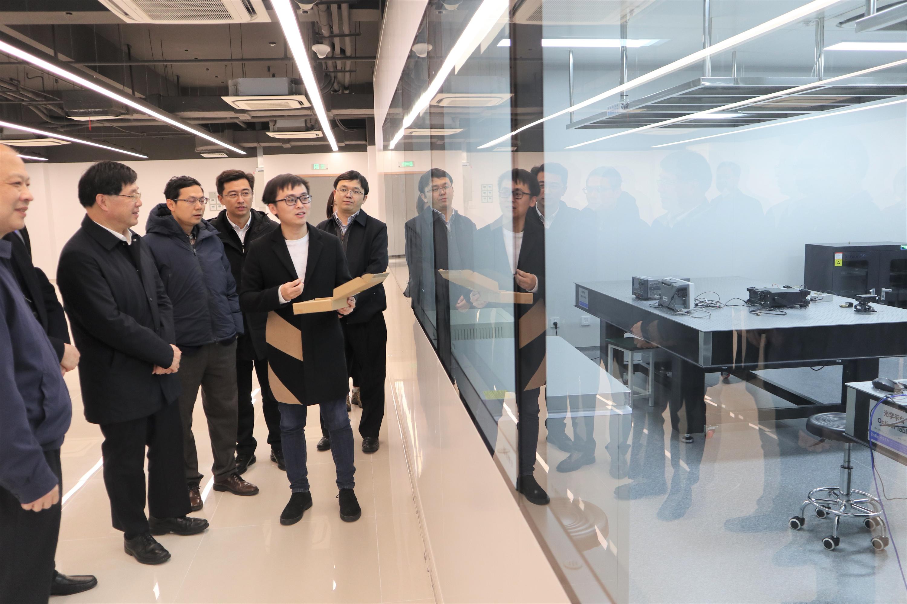 在光电院展厅,李焱院长向沈书记介绍了目前光电院的人才团队、研究单元、科研成果和产业化前景,沈书记对光电院目前的发展表示肯定,对未来的产业化前景表示期许。随后沈书记一行参观了光电子芯片与信息系统研究室和高分辨显微成像研究室,听取了两个研究室人员对正在开展的研发工作的介绍,了解研究院首批两个自主科技项目的研发进展及成果转化进度。