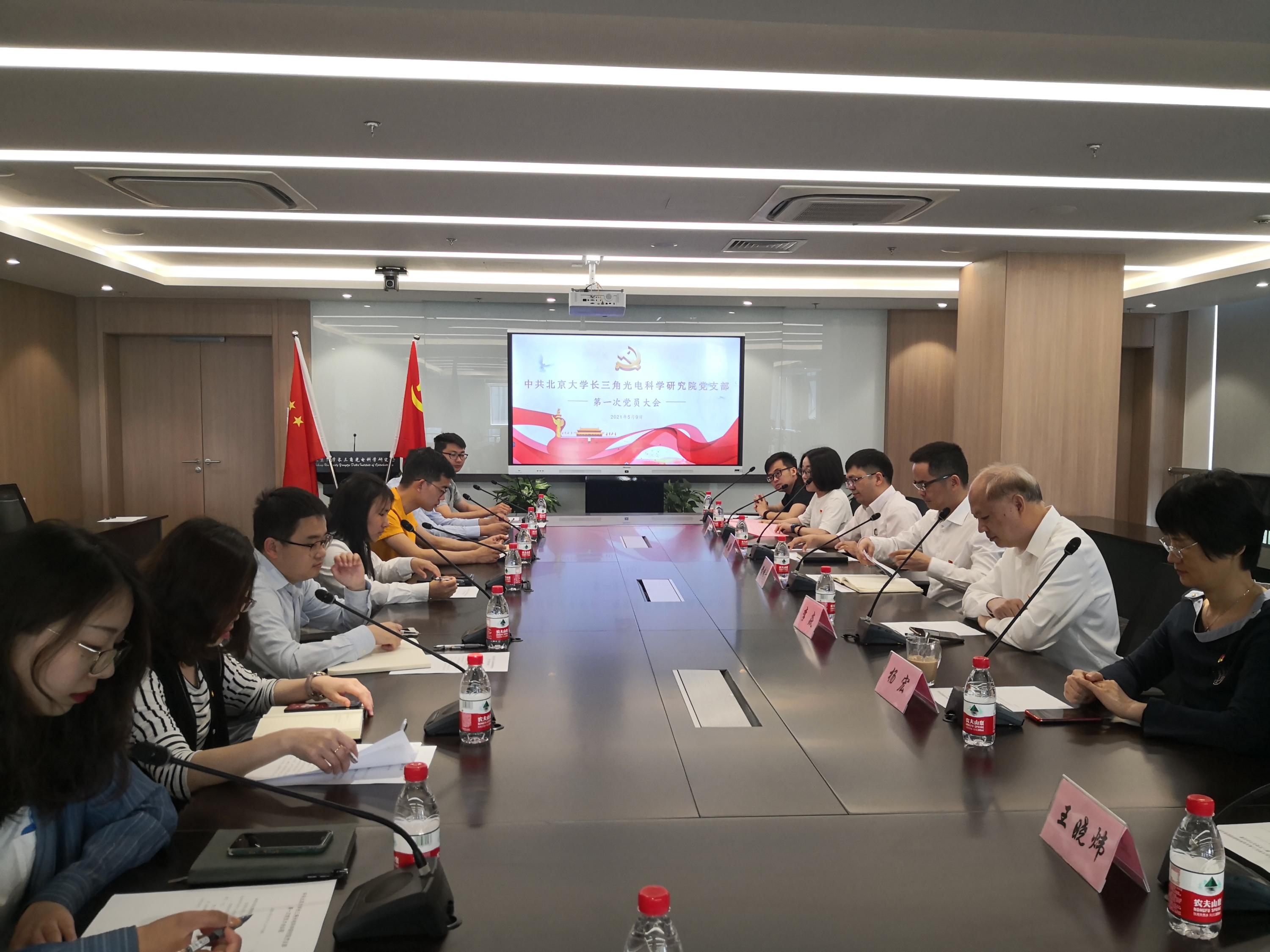 近日,中国共产党北京大学长三角光电科学研究院党支部获批成立。2021年5月9日上午,党支部第一次党员大会在光电院4楼会议室顺利召开。光电院全职员工中的11名党员同志出席了会议。南通市中央创新区建设投资有限公司党委副书记黄培丰同志代表通创投公司党委出席大会并给予指导。光电院李焱院长、杨宏副院长也出席大会,对大会的召开表示祝贺。