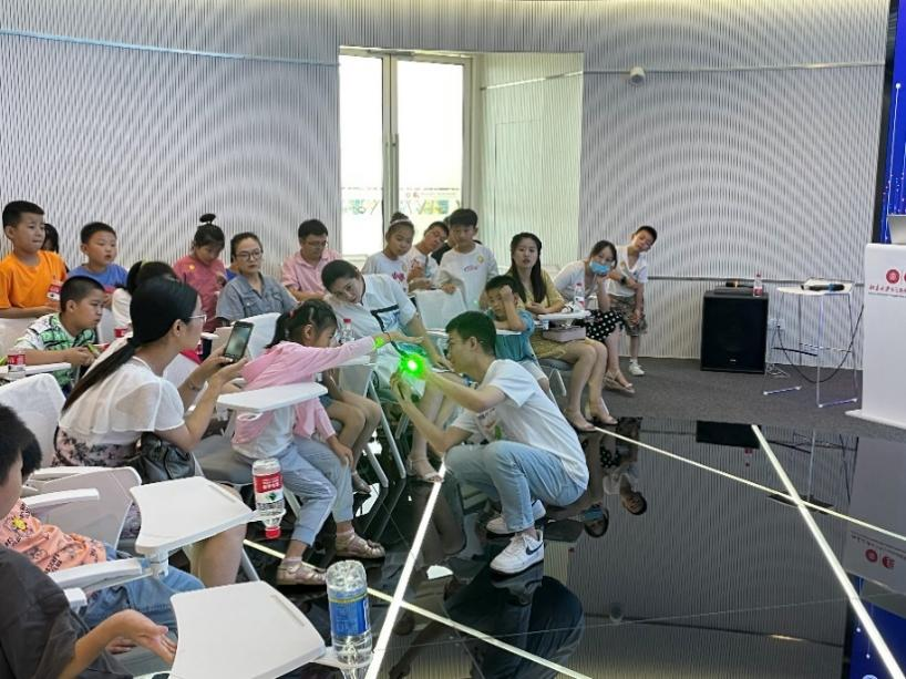 暑期系列科普活动还邀请了来自北京大学、中科院上海光学精密机械研究所和光电院的科研工作者,他们为大家带来了妙趣横生的科普讲座及现场小实验。通过讲座,大家初识光电科学;通过各类物理小实验,大家知道了光的折射、光的衍射、视觉暂留、光电转化等许多光电现象;通过科普动画片,激发了大家学科学、爱科学的热情。