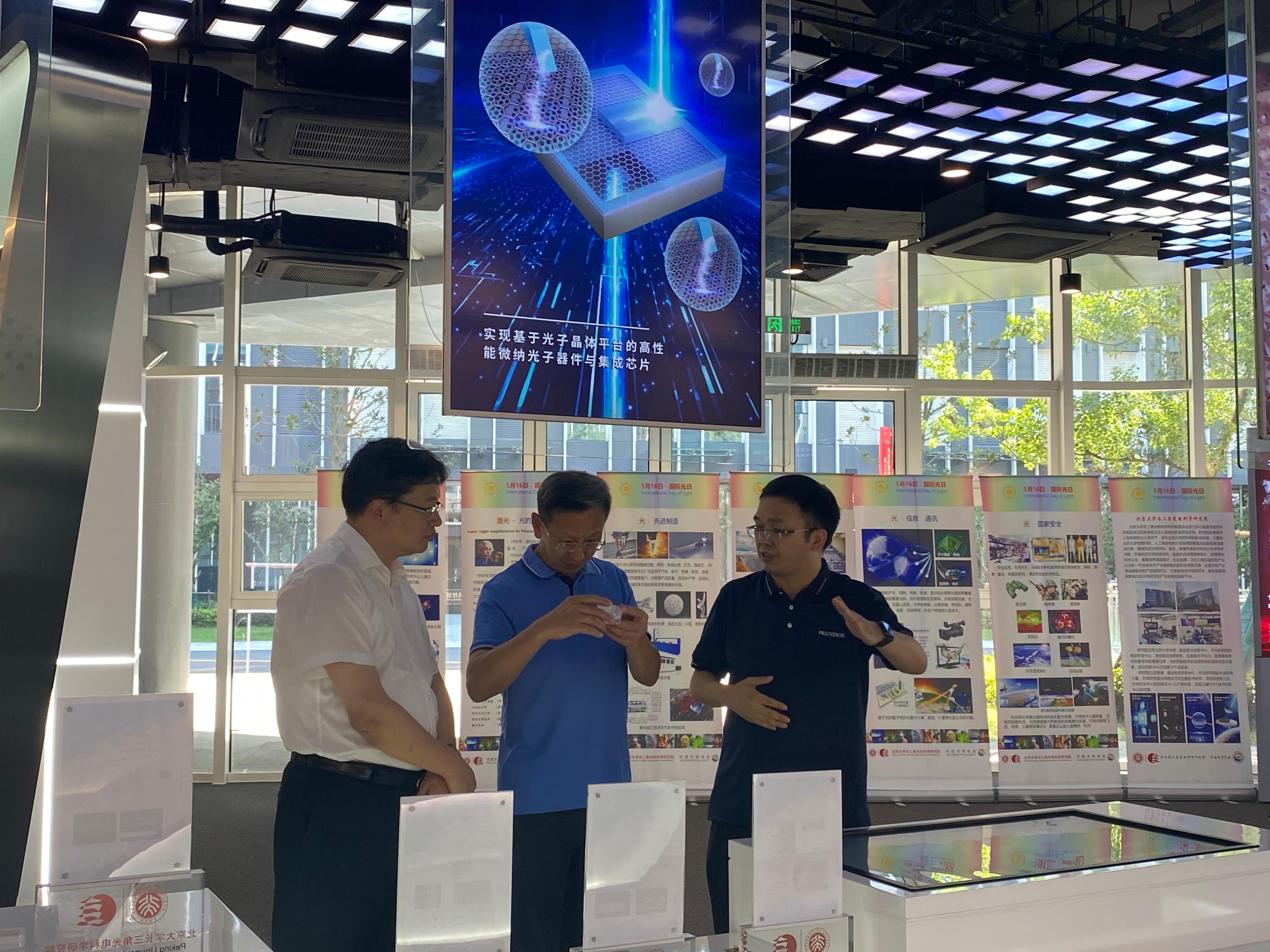 随后,吴部长一行参观了光电子芯片与信息系统及高分辨显微成像研究室。光电子芯片与信息系统研究室杨丰赫博士、高分辨显微成像研究室高翔博士分别介绍了两个实验室的平台建设、人员构成、研发进展及产业化应用前景等方面的情况。最后,吴陈钢一行参观了光电院的行政办公区,查看了光电院内部管理制度、2020年度事业单位法人年度报告等材料。