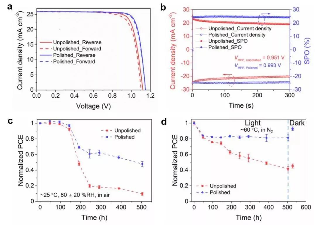 得益于开路电压与填充因子的提升,器件效率从23.07%提高到了24.50%。由于残留碘化铅晶体引起界面离子迁移与光降解途径也被抑制和阻断,器件的迟滞效应显著降低,稳定性得到提升。该工作为制备高质量钙钛矿薄膜和获得高性能钙钛矿光电器件开辟了一条新途径。