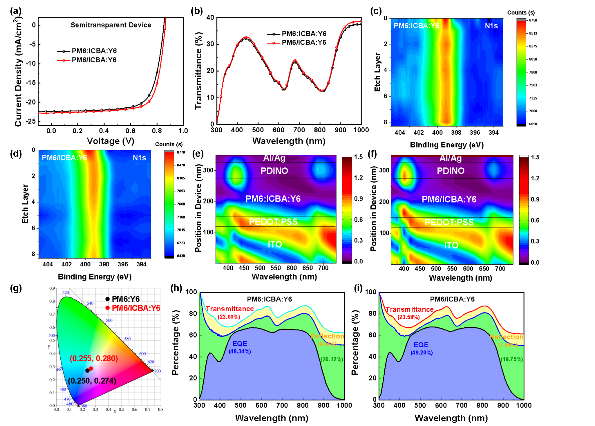 图3 半透明有机光伏器件的(a)J-V曲线和(b)透射光谱。基于(c)PM6:ICBA:Y6和(d)PM6/ICBA:Y6体系活性层薄膜的深度X射线光电子能谱。基于(e)PM6:ICBA:Y6和(f)PM6/ICBA:Y6体系的半透明有机太阳电池器件的光电场|E|2分布图。(g)基于PM6:Y6和PM6/ICBA:Y6体系半透明有机光伏器件的色坐标。基于(h)PM6:ICBA:Y6和(i)PM6/ICBA:Y6结构的半透明有机光伏器件的光能分布比例图谱。