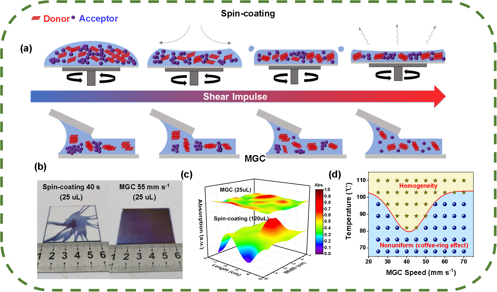 图1 (a)不同剪切冲量条件下活性层薄膜中给受体的分布示意图 (b)不同制备工艺下活性层薄膜(25cm2)的实物图片 (c)不同制备工艺条件下所制备的大面积(25cm2)薄膜的UV-vis吸收强度分布 (d)MGC工艺制备的活性层膜的均匀化条件。