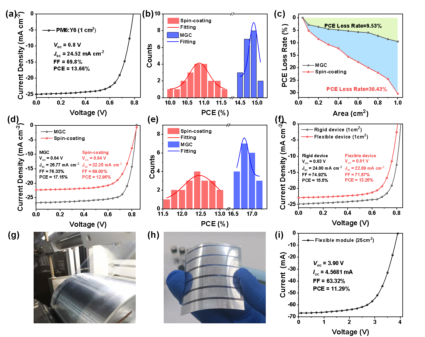 图2 (a)PM6:Y6的大面积(1cm2 )器件的J-V曲线 (b)不同制备工艺下基于PM6:Y6 OSCs的PCE分布 (c)不同制备工艺下器件的PCE损失率随面积的变化 (d)PM6:BTP-eC9体系小面积(0.04 cm2)器件的J-V曲线 (e)不同制备工艺下,基于PM6:BTP-eC9 OSCs的PCE分布 (f)PM6:BTP-eC9体系大面积刚性及柔性器件的J-V曲线 (g)柔性模组卷对卷工艺制备过程图 (h)柔性模组的实物照片。(有效面积为14.63cm2) (i)使用卷对卷工艺制备PM6:BTP-eC9柔性模组的J-V曲线