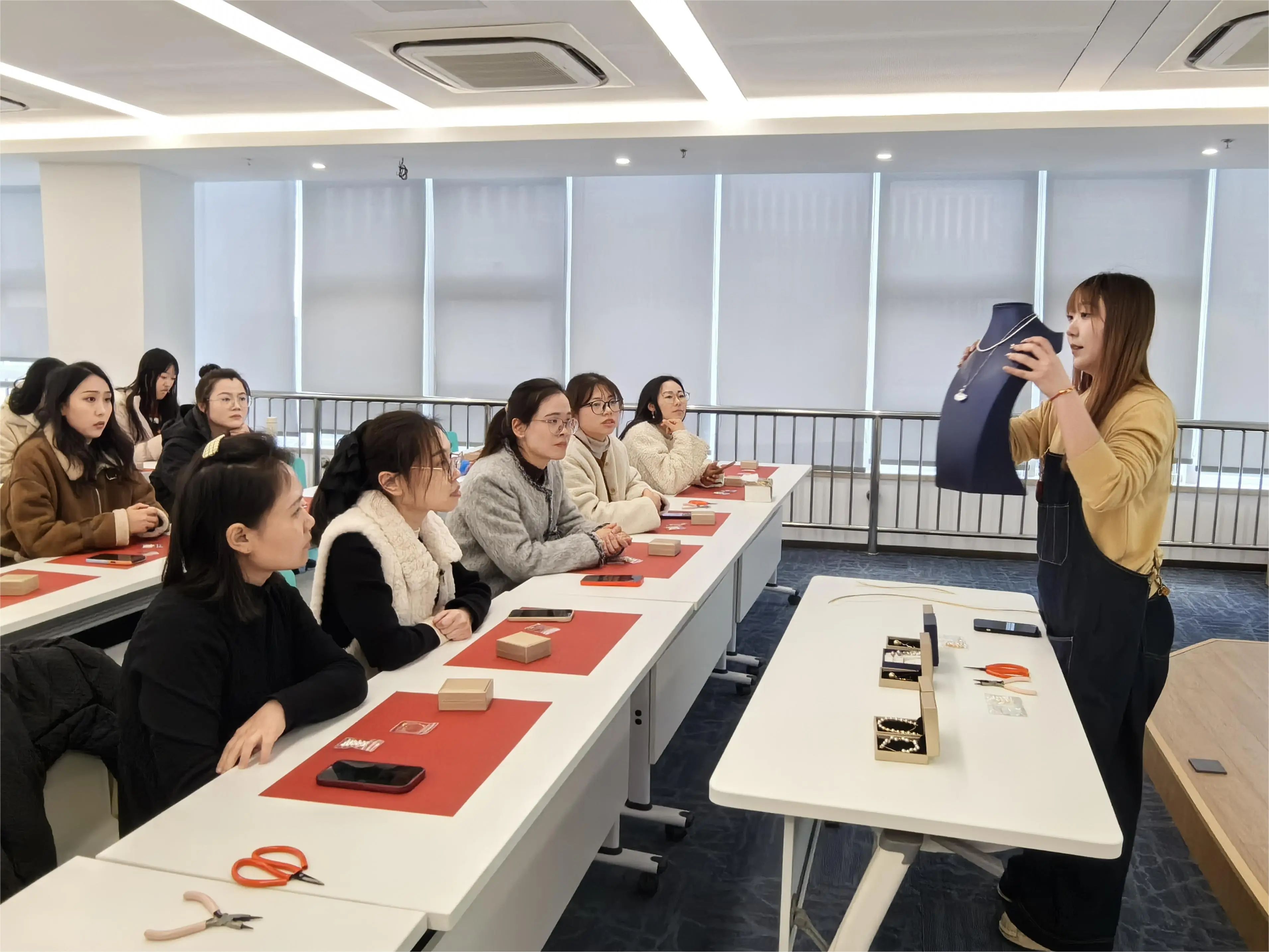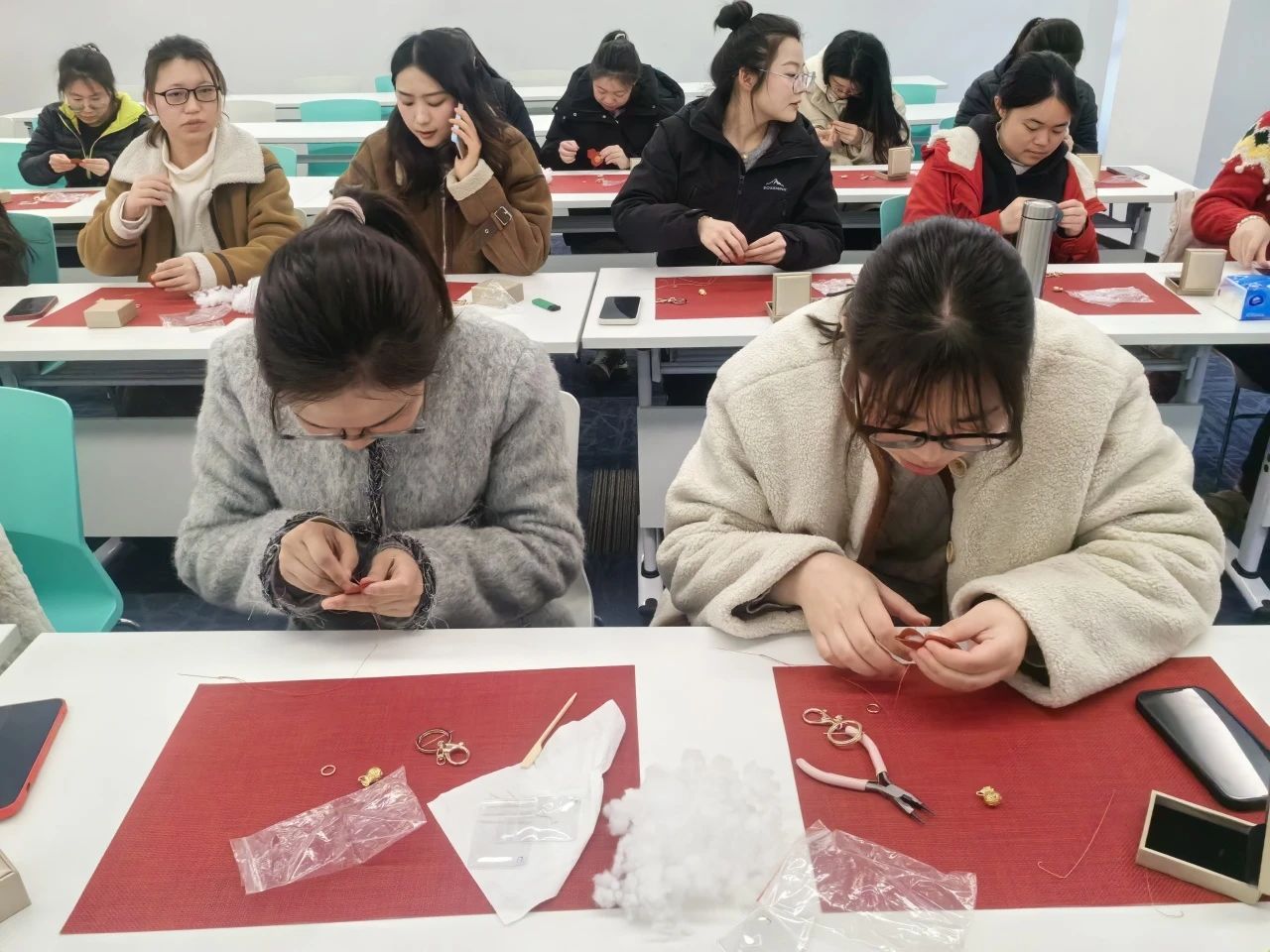 活动中,培训老师一边做着演示,一边耐心细致讲解制作的步骤和方法,大家兴致盎然地互相交流讨论。在老师的专业、悉心的指导下,大家飞珠走线,色彩缤纷的珠子、晶莹剔透的线条,在每一位女职工的巧手下被赋予了璀璨的生命。即便大家之前没有学习过编织串珠,但凭着认真的学习态度,都能很快上手,最后一串串精美的珍珠手链在大家的欢声笑语中诞生了。接下来,大家又跟随老师精心缝制了葫芦形的皮质福袋,寓意2024年生活福气多多,工作活力满满。看着各自手工制出的成品,大家脸上都绽放出灿烂的笑容,满满的成就感油然而生。整个活动营造出暖心向上的温馨氛围,让全体女职工一起度过了一个愉快而有意义的节日。