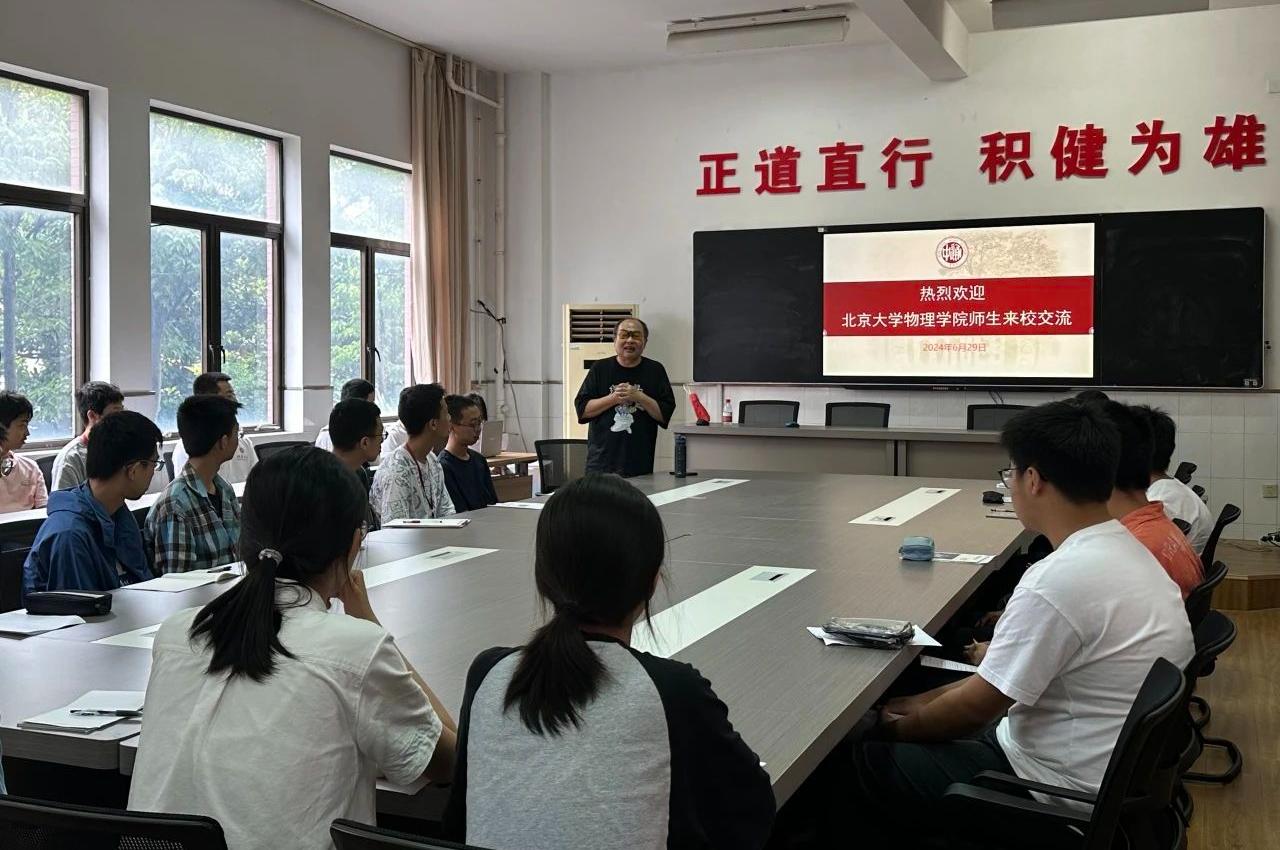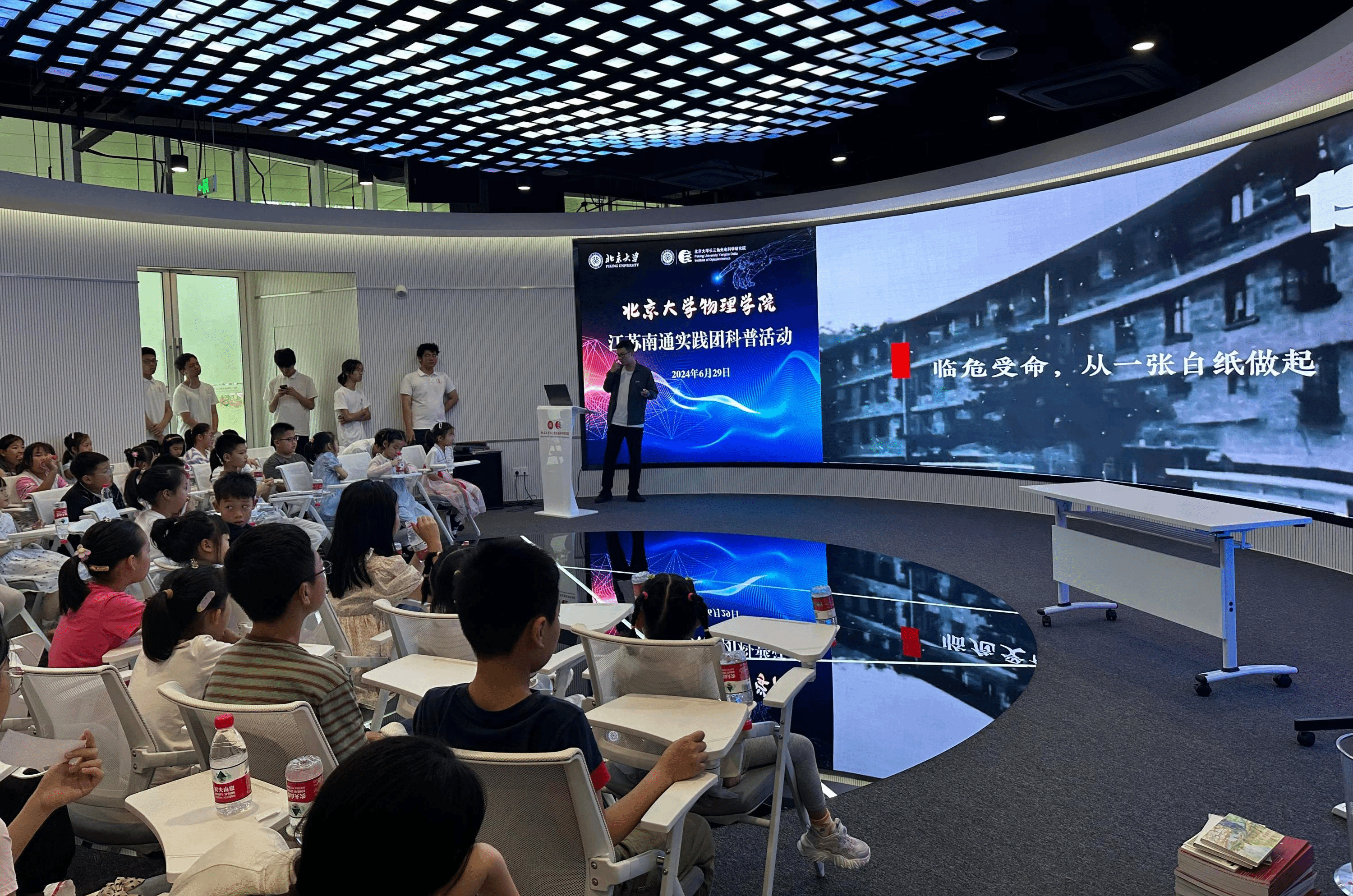 当日下午,实践团部分学生走进南通中学附属实验学校,参观学校并进行学习经验及北大学习生活分享交流。在南通中学附属实验学校党政办主任陈志良的带领下,实践团参观了学校的各类特色教室,如模拟法庭,人工智能创新实验室,无人机教室等。随后,实践团的学生与通中附校的学子漫谈北大的学习生活,同时带来有关物理学的介绍,并在讲解过程中与现场的同学们进行了有趣且有料的互动与交流。