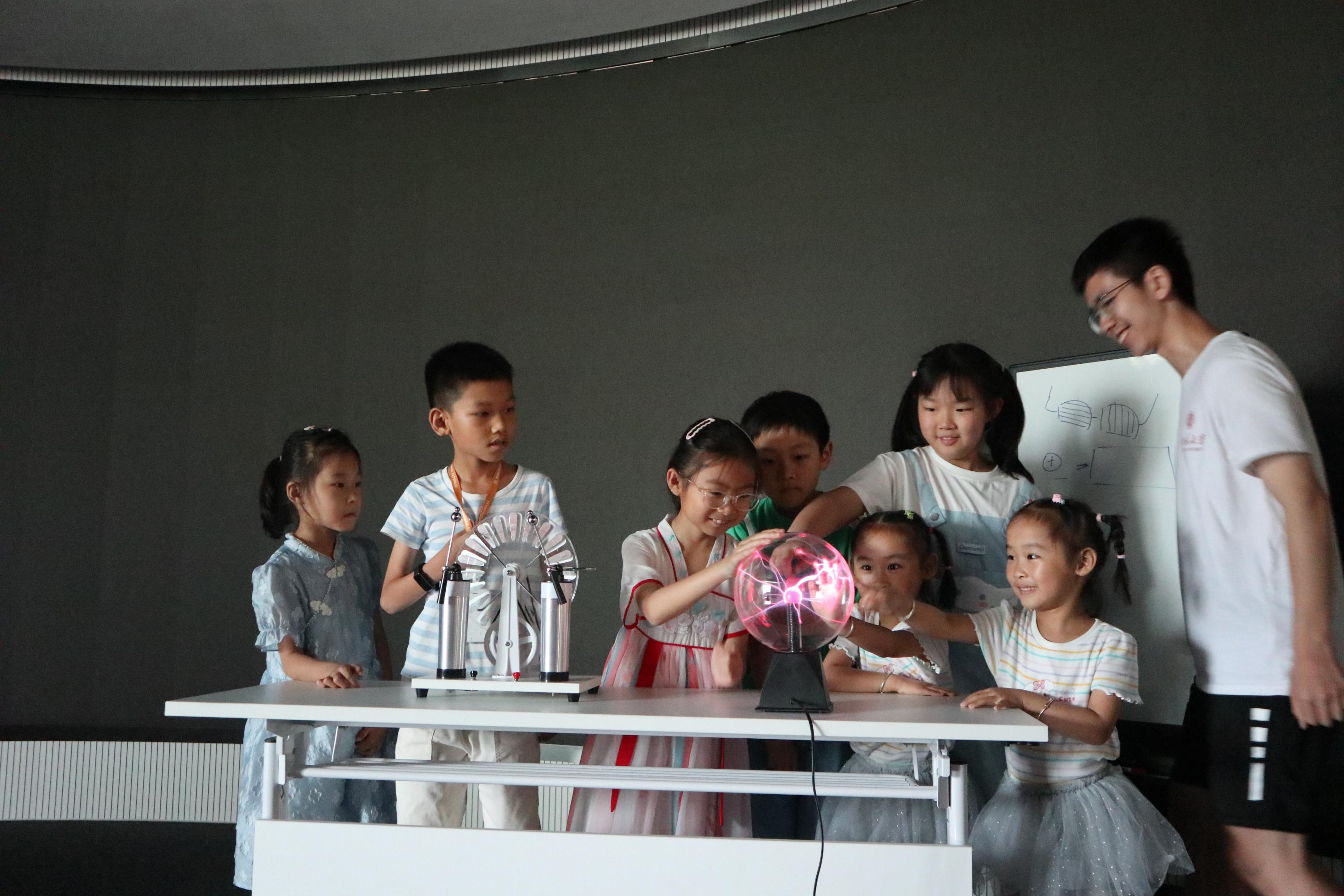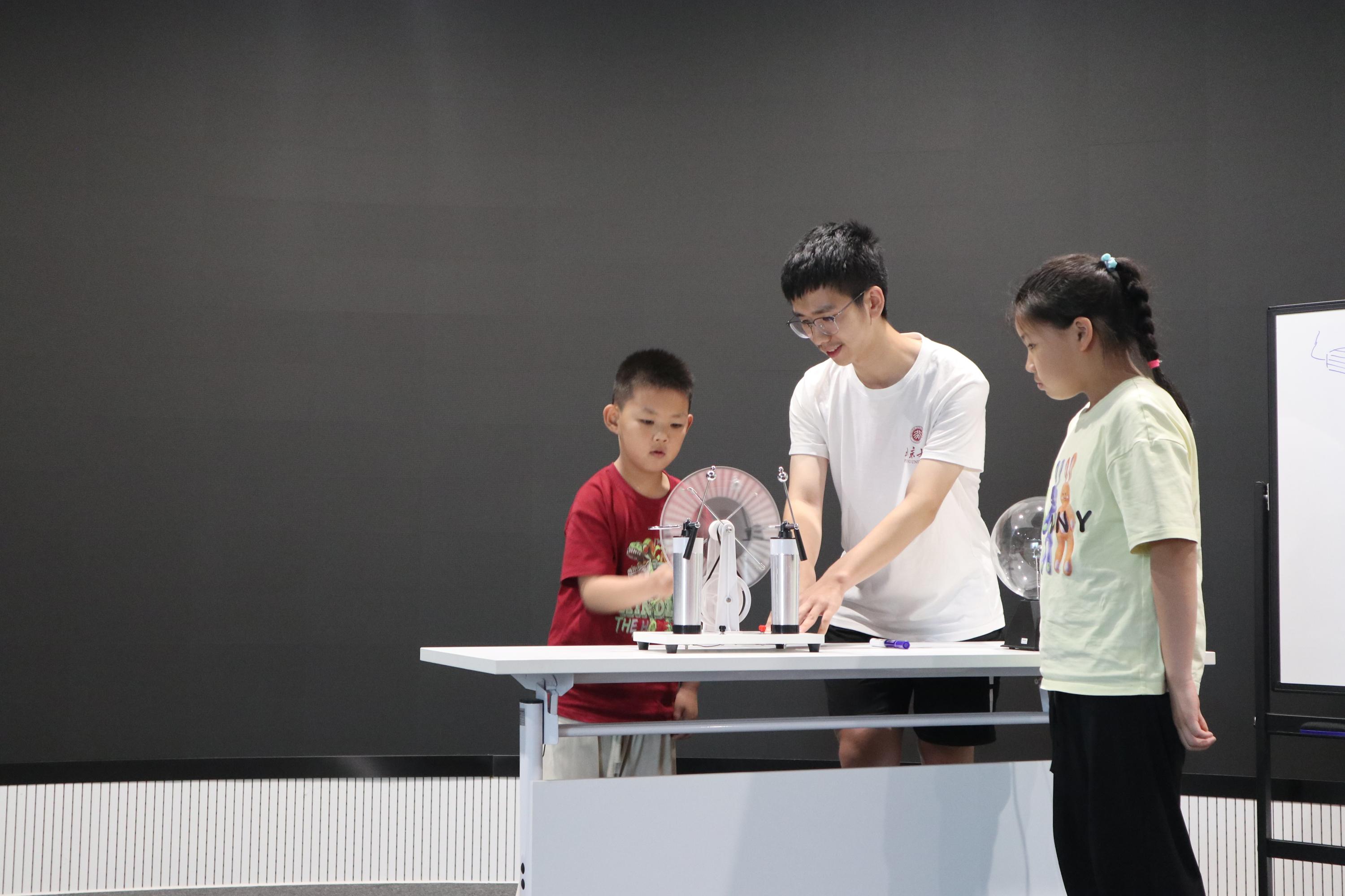 下午,实践团在研究院展厅给南通中小学生带来了一场趣味横生的物理实验科普志愿服务活动,吸引了近六十多名学生及家长前来参加。实践团的“小老师”们带领学生们从生活中的自然现象出发,启发小朋友们思考现象的原因并带领学生们通过实验的方式验证各种猜测是否正确。通过精巧的设计、生动的演示和风趣的话语,“小老师”们呈现一场有关热学、电磁学和光学等方面的精彩科普,将物理学原理描绘的有声有色,把小朋友们带入了一个妙趣横生的物理世界。
