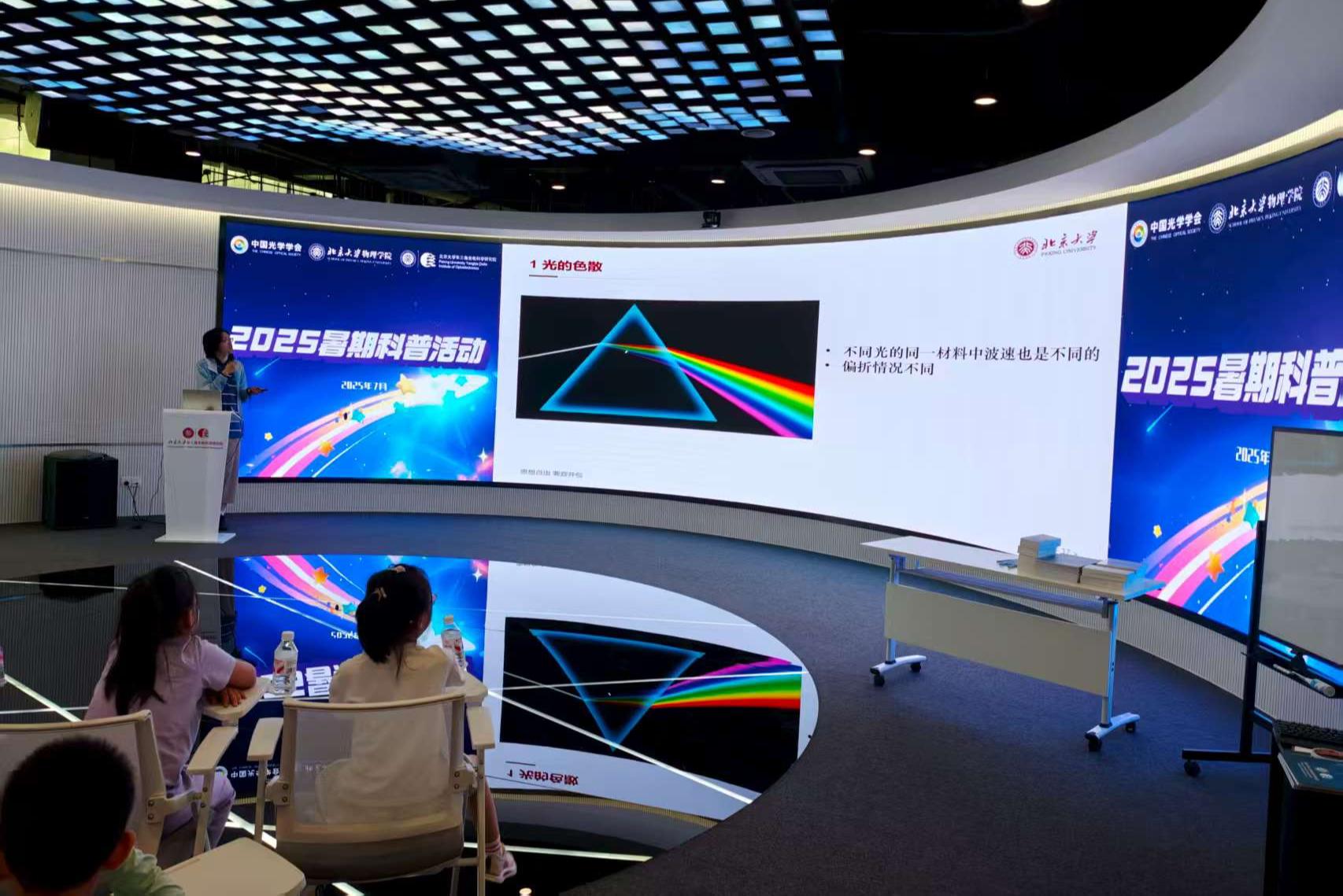 7月25日至26日,来自北京大学物理学院的博士后贾新宇,博士研究生孟祥瀚、游畅,以及专业硕士研究生周少锋分别带来精彩科普分享。孟祥瀚以《彩虹解密手册——色散》为题,用生活实例拆解光的色散原理,从牛顿的棱镜实验讲到现代显示技术,让抽象的光学概念化作看得见、摸得着的科学现象;周少峰在《永不熄灭的科学之光——两弹元勋郭永怀》中,用珍贵的历史照片与故事,讲述了郭永怀先生在极端艰苦的条件下,如何带着科研资料从国外归来,为"两弹一星"事业奉献一生的家国情怀;游畅的《激光的科学秘密》主题科普,生动解析激光的单色性、方向性原理,并展示了激光在工业制造、医疗健康等领域的神奇应用;贾新宇则在《光的"波浪舞"——干涉与衍射》中,借助水波干涉、光的衍射等实验演示,生动展现光的波动特性,让孩子们真切领略光的神奇之处。