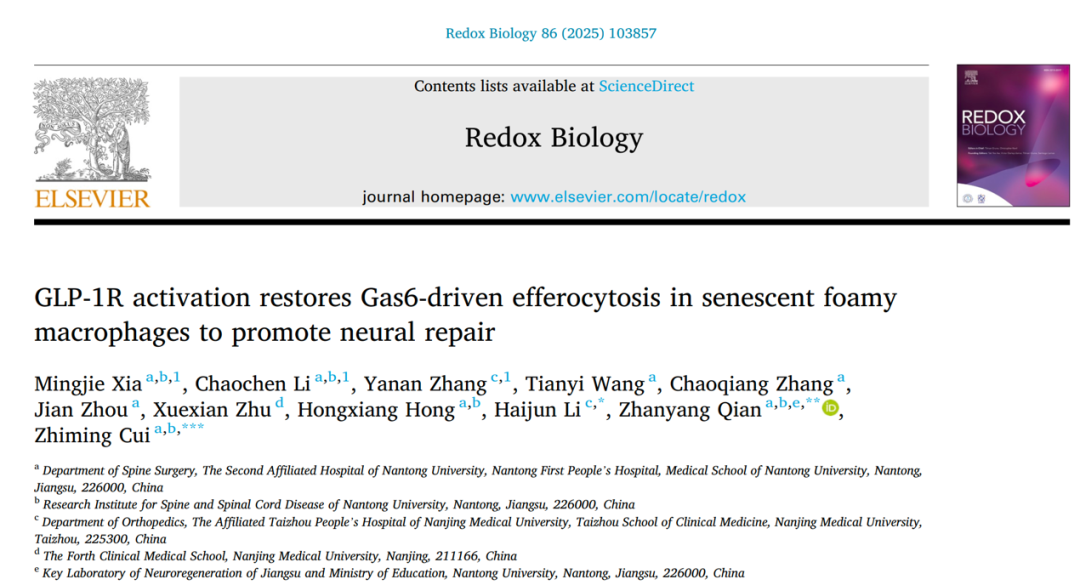 2025年9月3日,我院脊柱外科、脊柱脊髓疾病研究所团队在中科院1区TOP期刊 《Redox Biology》(IF 11.9)在线发表题为“GLP-1R activation restores Gas6-driven efferocytosis in senescent foamy macrophages to promote neural repair”(GLP-1R激活可恢复衰老泡沫巨噬细胞中由Gas6介导的胞葬作用,从而促进神经修复)的研究成果,这也是该团队今年发表的第二篇影响因子超10分的原创性研究论文。