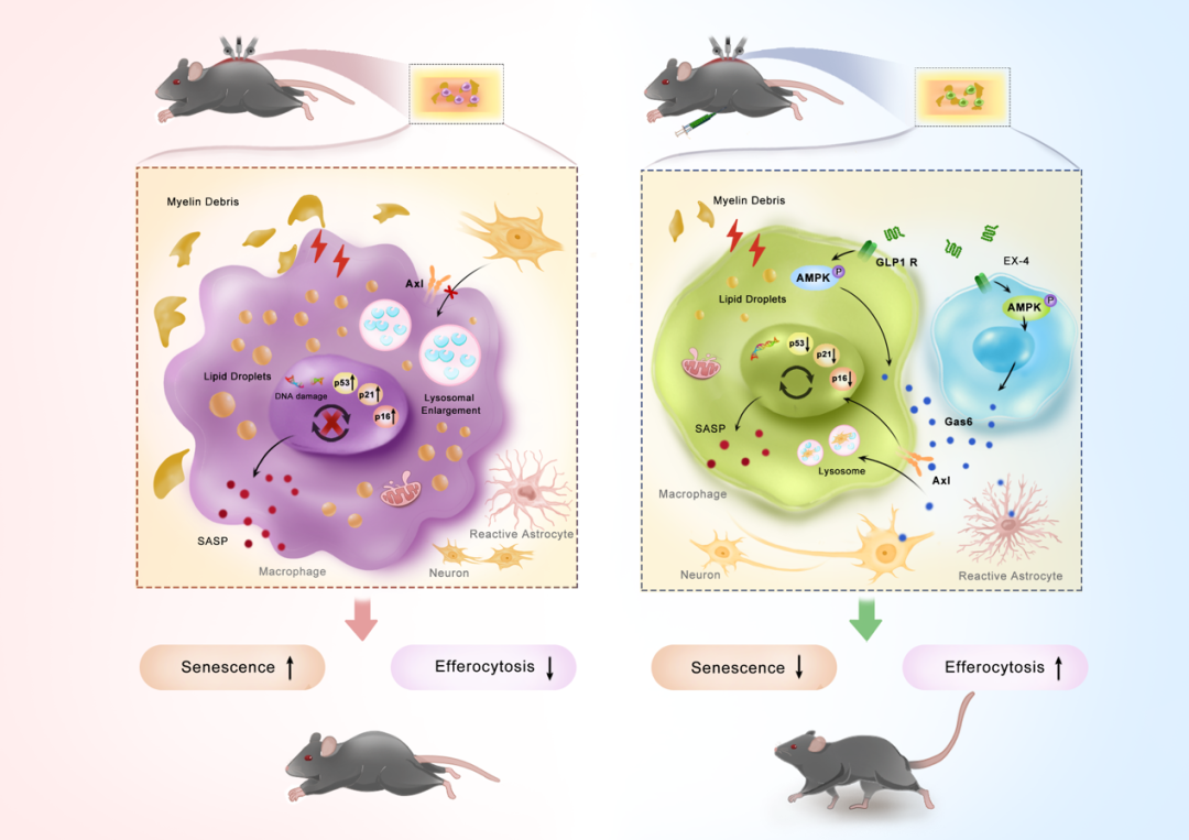 该研究首次发现SCI后巨噬细胞在过度吞噬MD后会发生细胞衰老,导致其清除凋亡细胞的能力下降,进而加剧神经炎症、阻碍神经修复;同时系统阐明GLP-1R/AMPK/Gas6/Axl轴在调控巨噬细胞衰老与神经修复中的作用,为SCI的免疫代谢治疗提供了新策略。