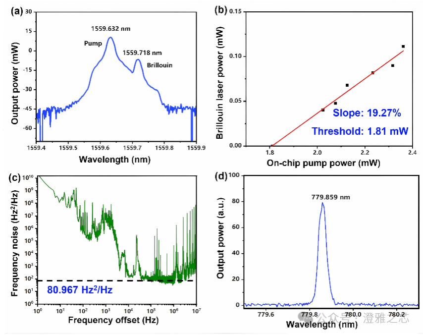 图 2(a) 受激布里渊激光的光谱图;(b) 布里渊激光输出功率随片上泵浦功率的演化;(c)布里渊激光的频率噪声谱,显示瞬时线宽仅为 254 Hz;(d) 布里渊倍频激光的光谱,其本征线宽为864 Hz。