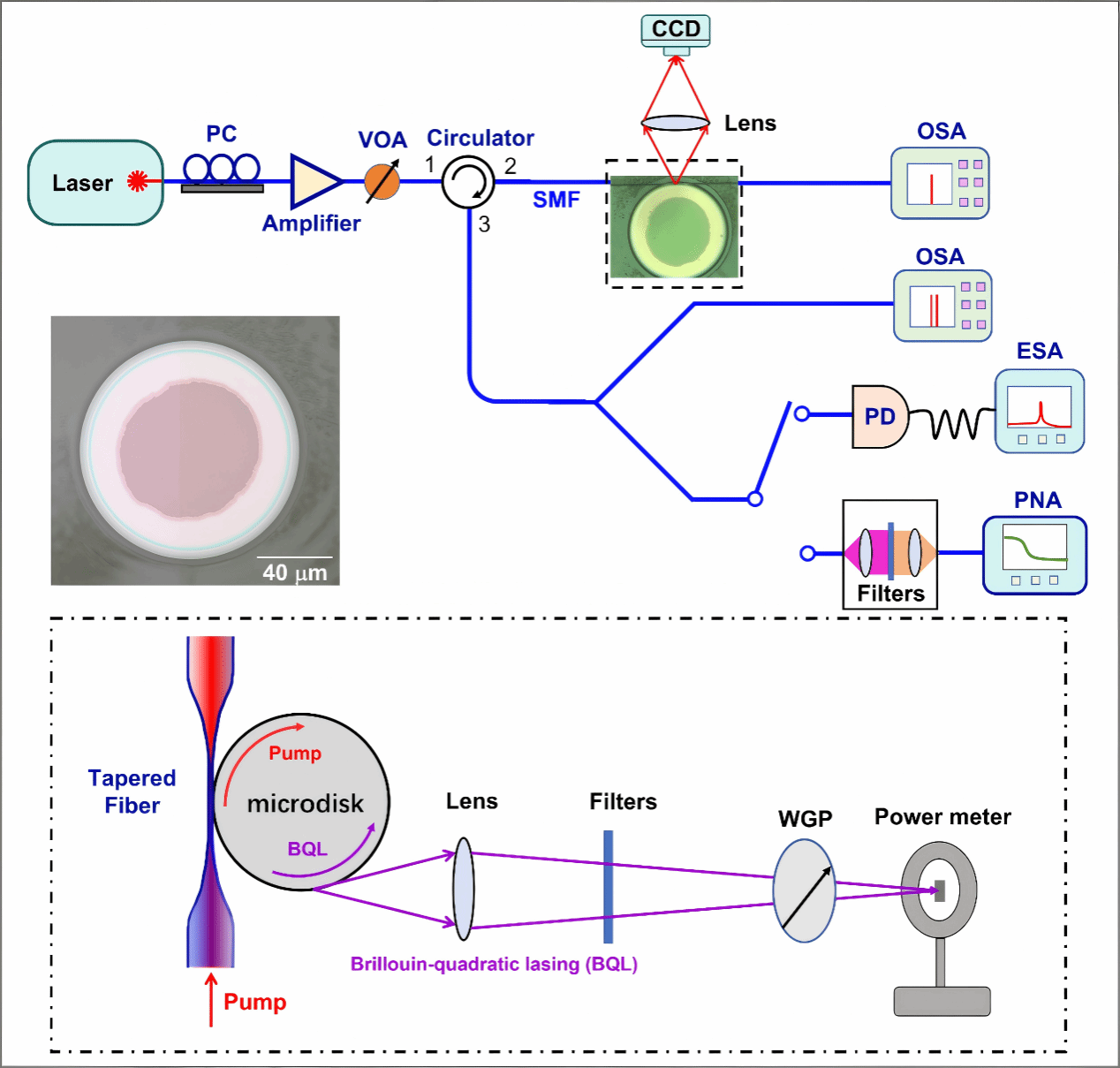图 1 布里渊二次谐波微盘激光器生成装置示意图。PC:偏振控制器;VOA:可变光衰减器;SMF:单模光纤;CCD:电荷耦合器件;OSA:光谱分析仪;PD:光电探测器;ESA:电学频谱分析仪;PNA:相位噪声分析仪。插图(左中)为微盘在光学显微镜下的图像。插图(底部)为微盘边缘的背向布里渊倍频激光(BQL)信号散射的功率测量与偏振分析。 WGP:线栅偏振片